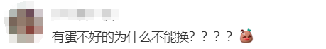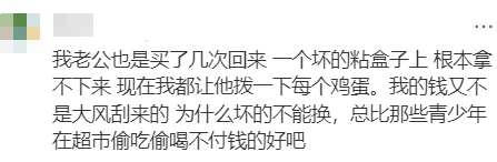 “我老公也是买了几次回来,一个坏的粘盒子上,根本拿不下来,现在我都让他拨一下每个鸡蛋。我的钱又不是大风刮来的,为什么坏的不能换?总比那些青少年在超市偷吃偷喝不付钱的好吧!”