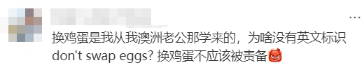 “换鸡蛋是我从我澳洲老公那学来的,为啥没有英文标识don’t swap eggs? 换鸡蛋不应该被责备。”