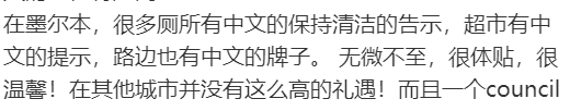 “在墨尔本,很多厕所有中文的保持清洁的告示,超市有中文提示,路边也有中文的牌子,无微不至,很体贴,很温馨,在其他城市并没有这么高的礼遇!”
