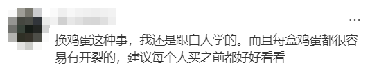 “换鸡蛋这种事,我还是跟白人学的。而且每盒鸡蛋都很容易有开裂的,建议每个人买之前都好好看看。”