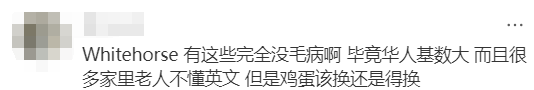 “Whitehorse有这些完全没毛病啊,毕竟华人基数大,而且很多家里老人不懂英文,但是鸡蛋该换还是得换。”