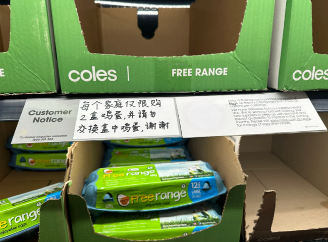 起因是有位博主进入墨尔本的一家Coles买鸡蛋,结果看到在鸡蛋货架前贴着一张中文提醒,于是将这幕拍下发到了社交平台,引发网友热议。