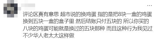 “评论区真有意思,超市说的换鸡蛋,指的是把8块一盒的鸡蛋换到五块一盒的盒子里,然后结账只付五块的,所以你买的八块的鸡蛋可能就是换过的五块那种,我见过不少华人老太太这样做。”