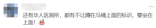 “还有华人区厕所,都有不让蹲在马桶上面的标识,要坐在上面!”