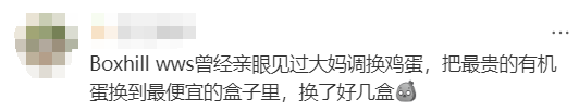 “Boxhill wws曾经亲眼见过大妈调换鸡蛋,把最贵的有机蛋换到最便宜的盒子里,换了好几盒。”