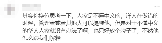 “其实你换位思考一下,人家是不懂中文的,洋人在做错的时候,管理者或者其他人可以提醒他,但是对于不懂中文的华人人家就没有办法了啊,也只好放个牌子了,不然他怎么跟我们解释。”