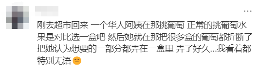 还有挑拣葡萄的:“刚去超市回来,一个华人阿姨在那挑葡萄,正常的挑葡萄水果是对比选一盒吧,然后她就在那把很多盒的葡萄都折断了,把她认为想要的一部分都弄在一盒里,弄了好久…我看着都特别无语。”