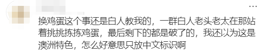 “换鸡蛋这个事还是白人教我的,一群白人老头老太在那站着挑挑拣拣鸡蛋,最后剩下的都是破了的,我还以为这是澳洲特色,怎么好意思只放中文标识啊?”