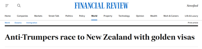 新西兰前移民部长Stuart Nash表示,特朗普再次当选是很多富裕美国人寻求海外居住资格的催化剂。“很多申请人和特朗普的政见不同”。